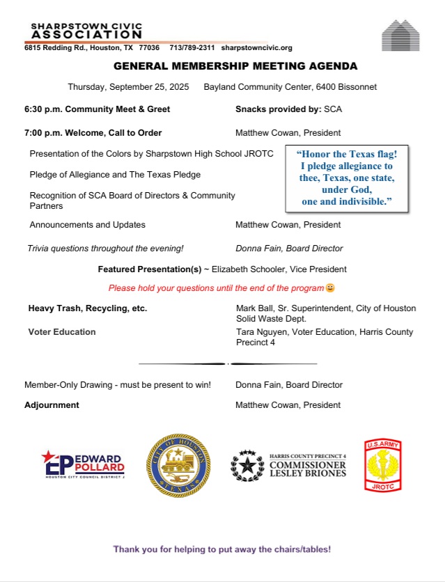 The Agenda for the September 2025 General Membership Meeting to be held on Thursday September 25th at 6:30 PM.