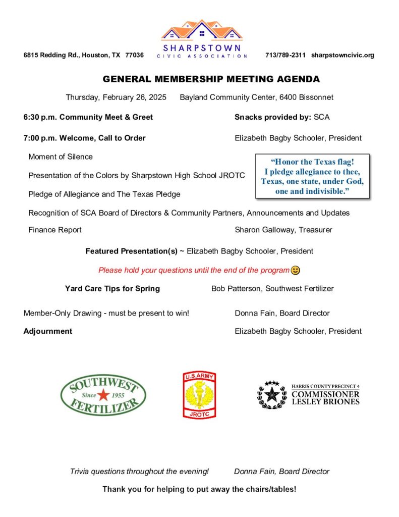 The Agenda for the February 2026 General Membership Meeting to be held on Thursday February 26th at 6:30 PM.